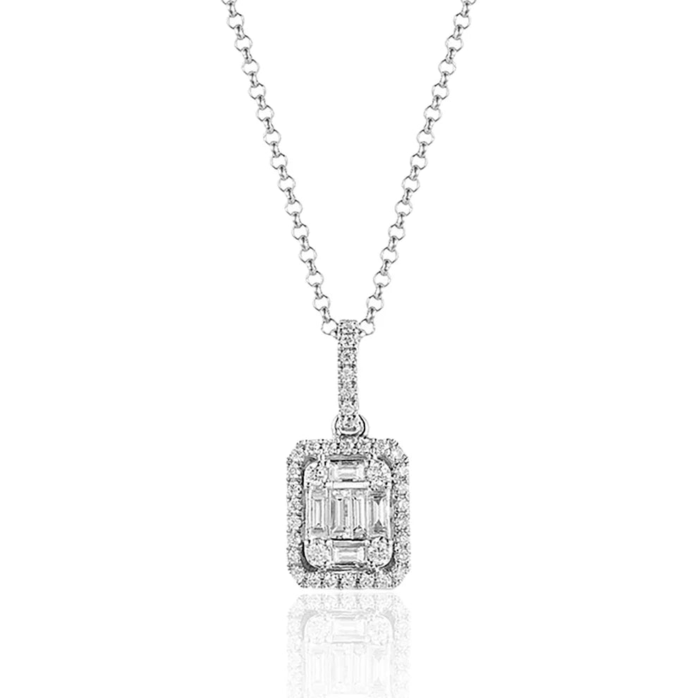 Baguette shape diamonds form a mosaic to represent an emerald cut stone surrounded by a border of round diamonds. The cable link chain measures 16" in length.