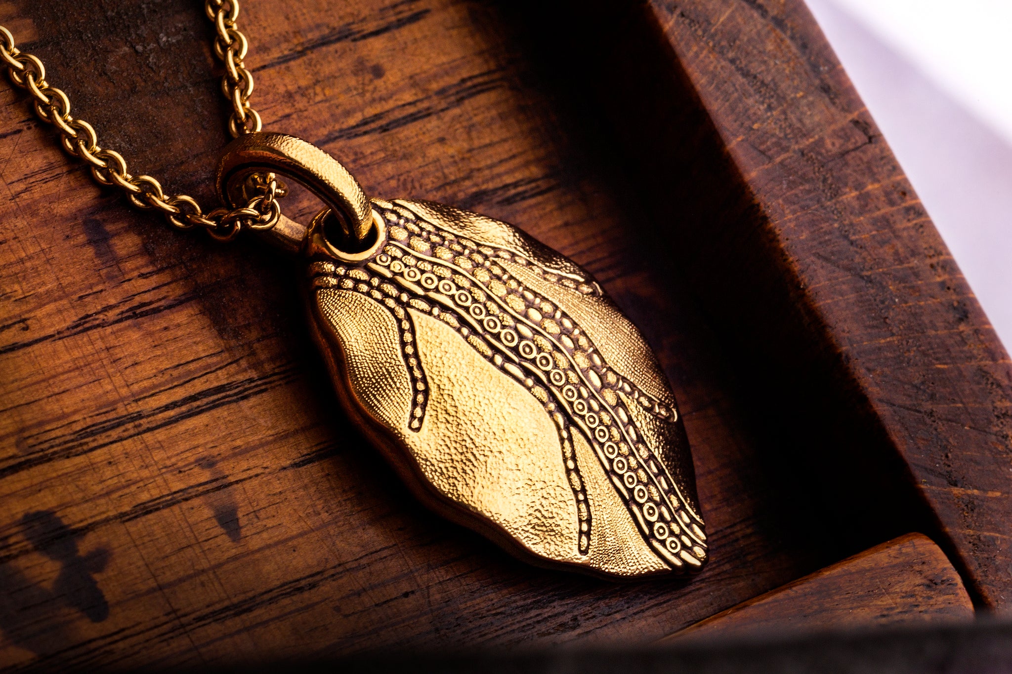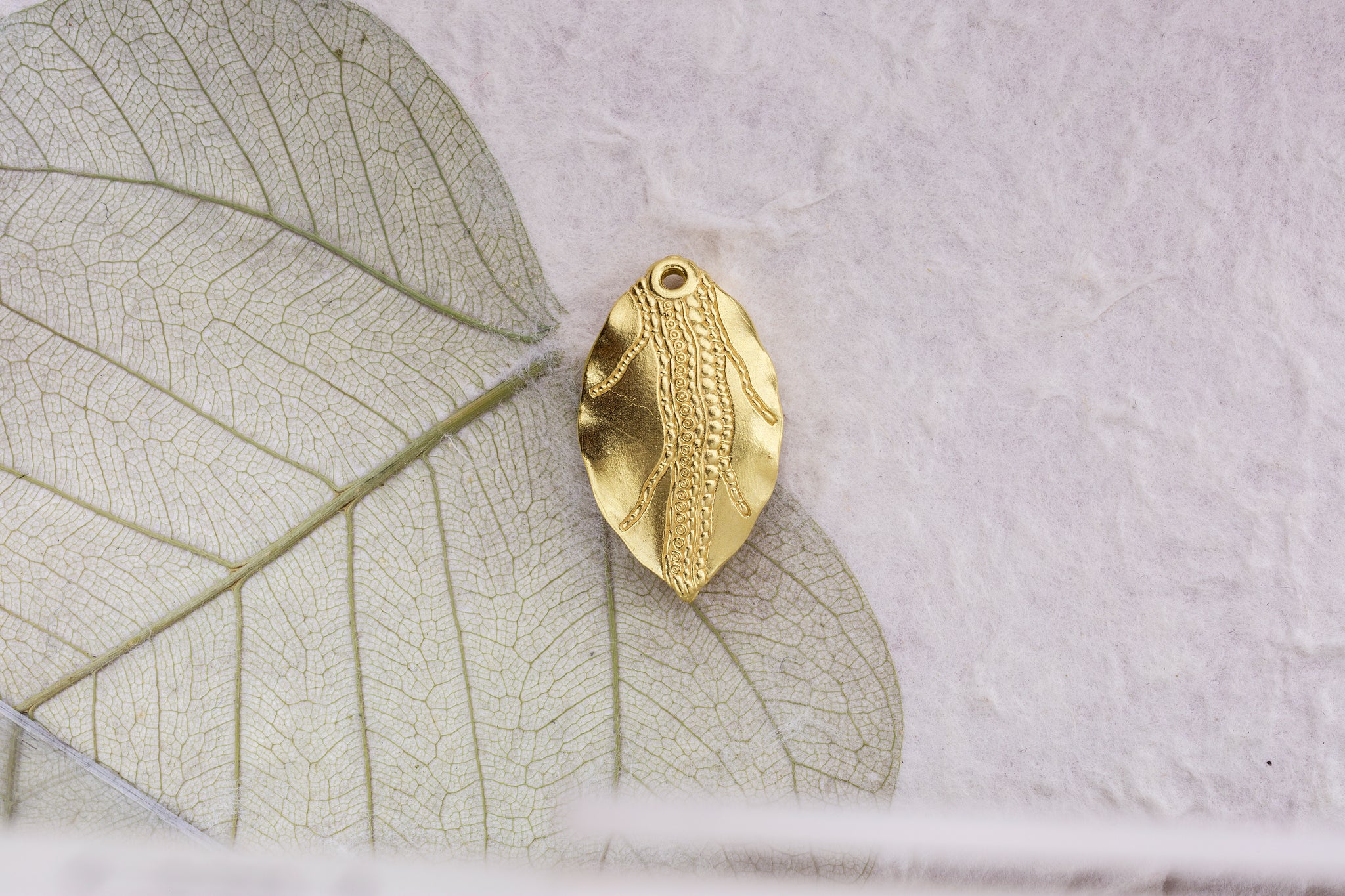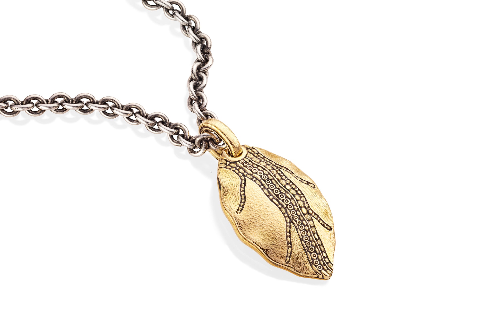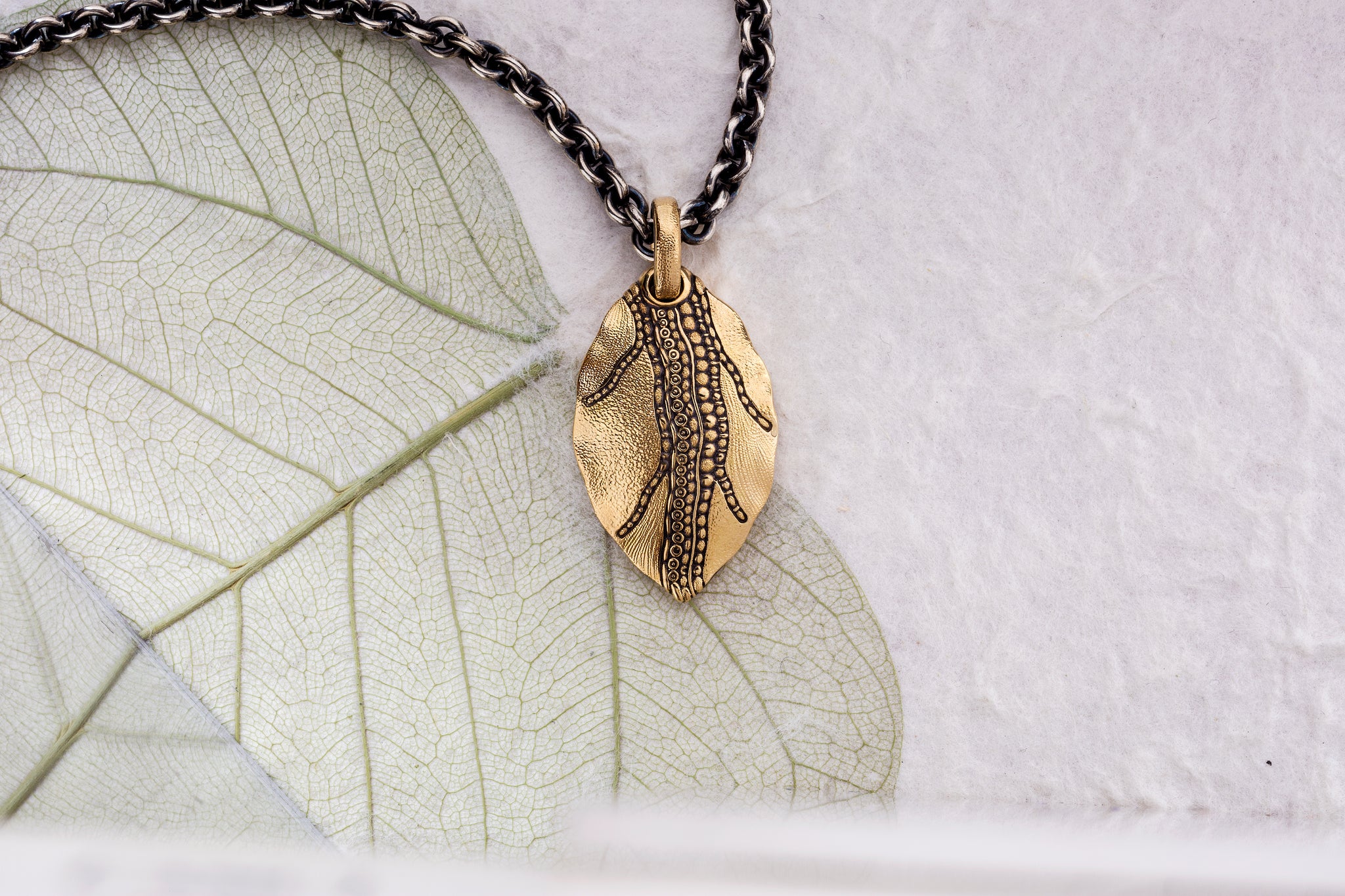 Crafted from 18K yellow gold, this leaf pendant is meticulously handmade in the Sepkus studio in New York City, showcasing exquisite microscopic detailing.