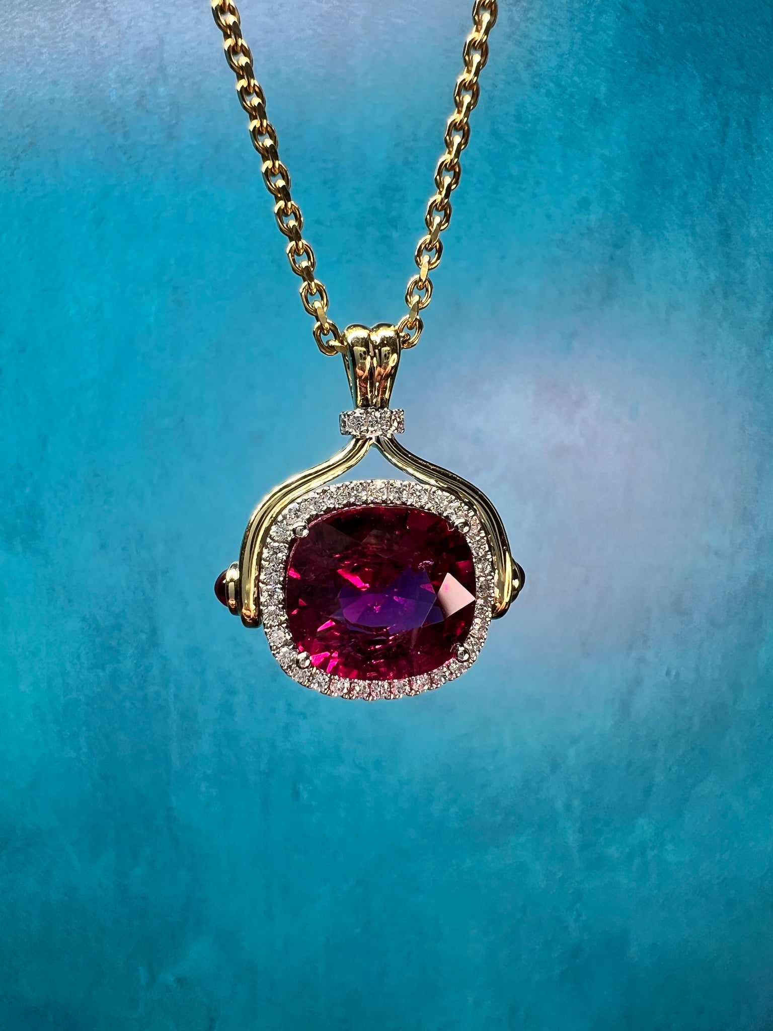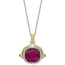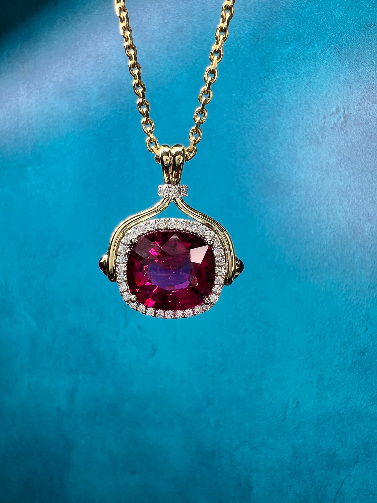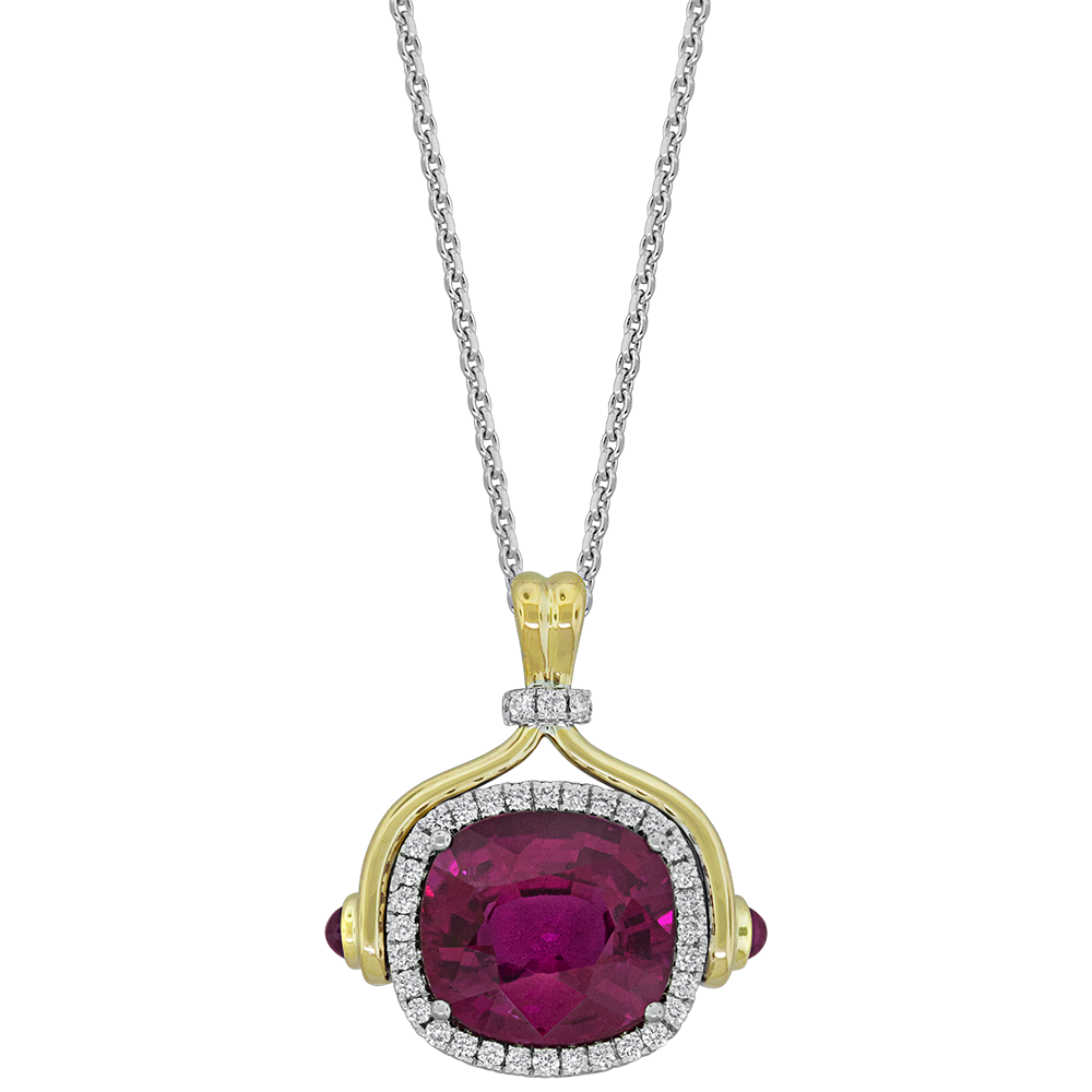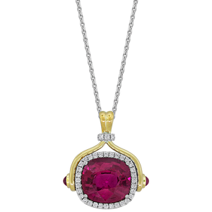 18k yellow gold and white gold pendant featuring one cushion shape rubellite tourmaline stone surrounded by diamonds.