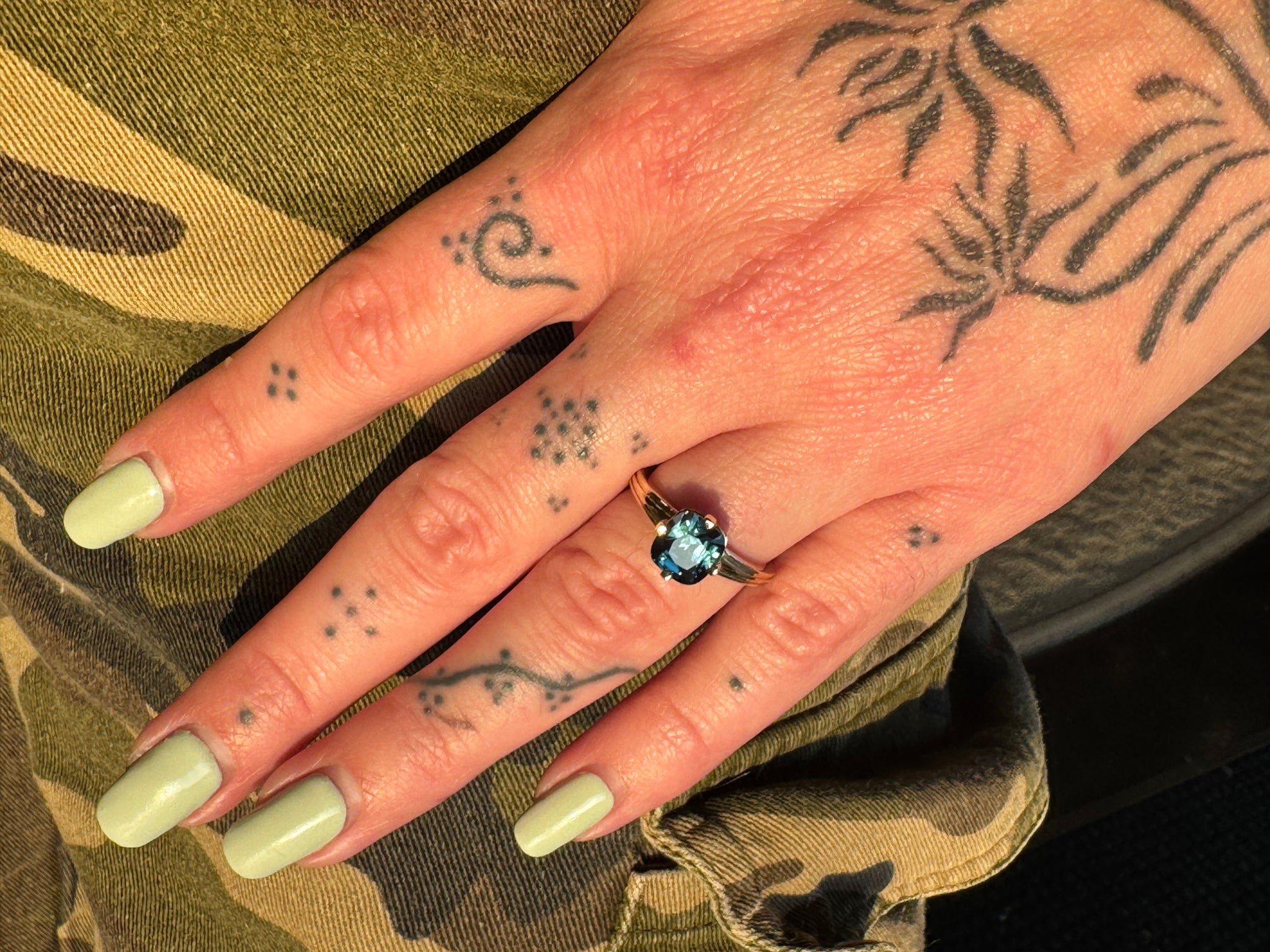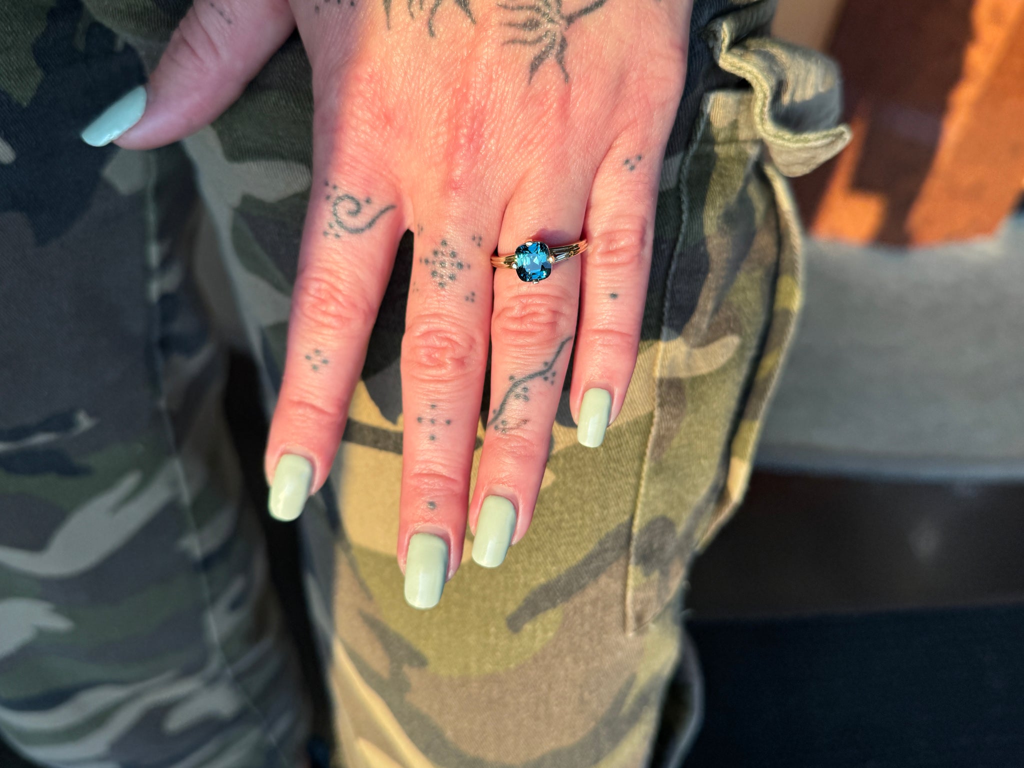14k yellow gold ring featuring one greenish blue sapphire weighing 3.19 CTS.