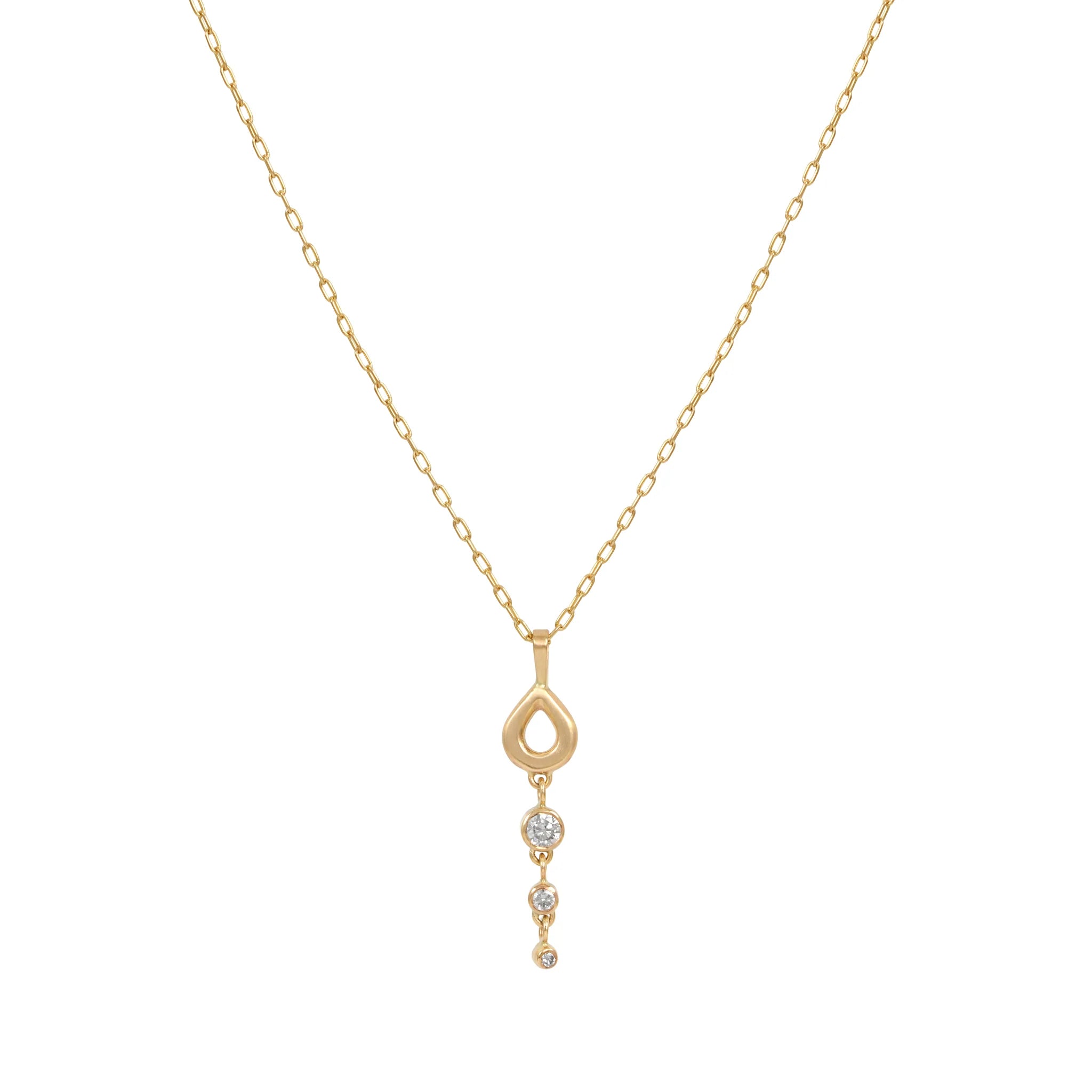 Like water droplets glistening as they fall, this gorgeous necklace features a golden raindrop pendant with graduating sizes of white diamonds dripping below. The Raindrops Necklace is the perfect addition of elegance to your everyday style.