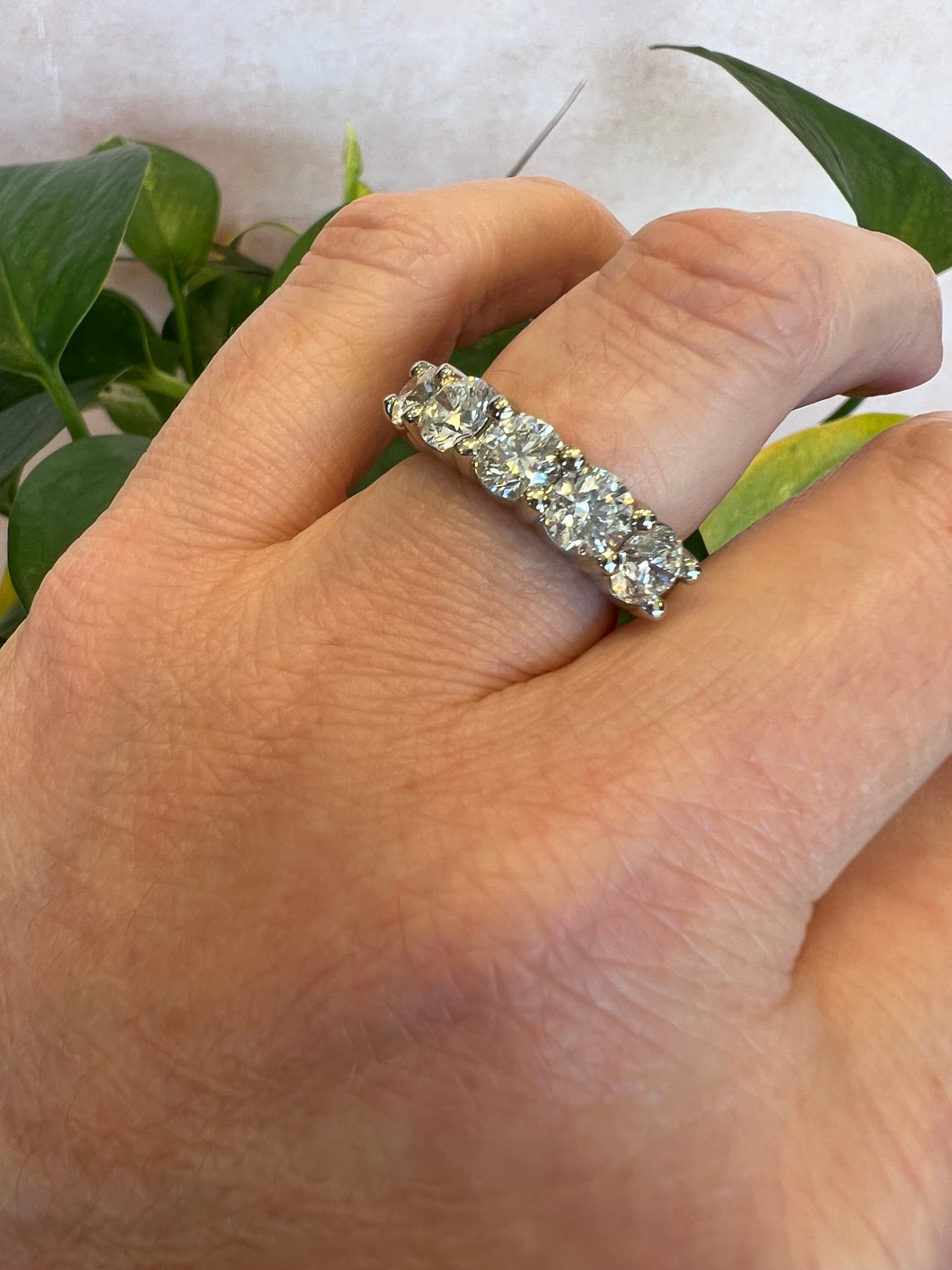 Five round brilliant diamonds matched in color and clarity are prong set across the top of this band with 3.00 CTW and H color SI1 clarity.