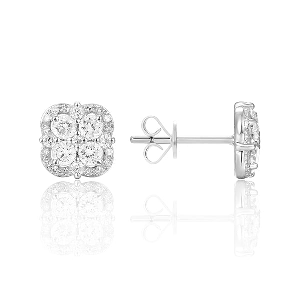 14K white gold with rhodium finish earrings. Each earring features round diamonds which are surrounded by a scalloped border set with diamonds too.