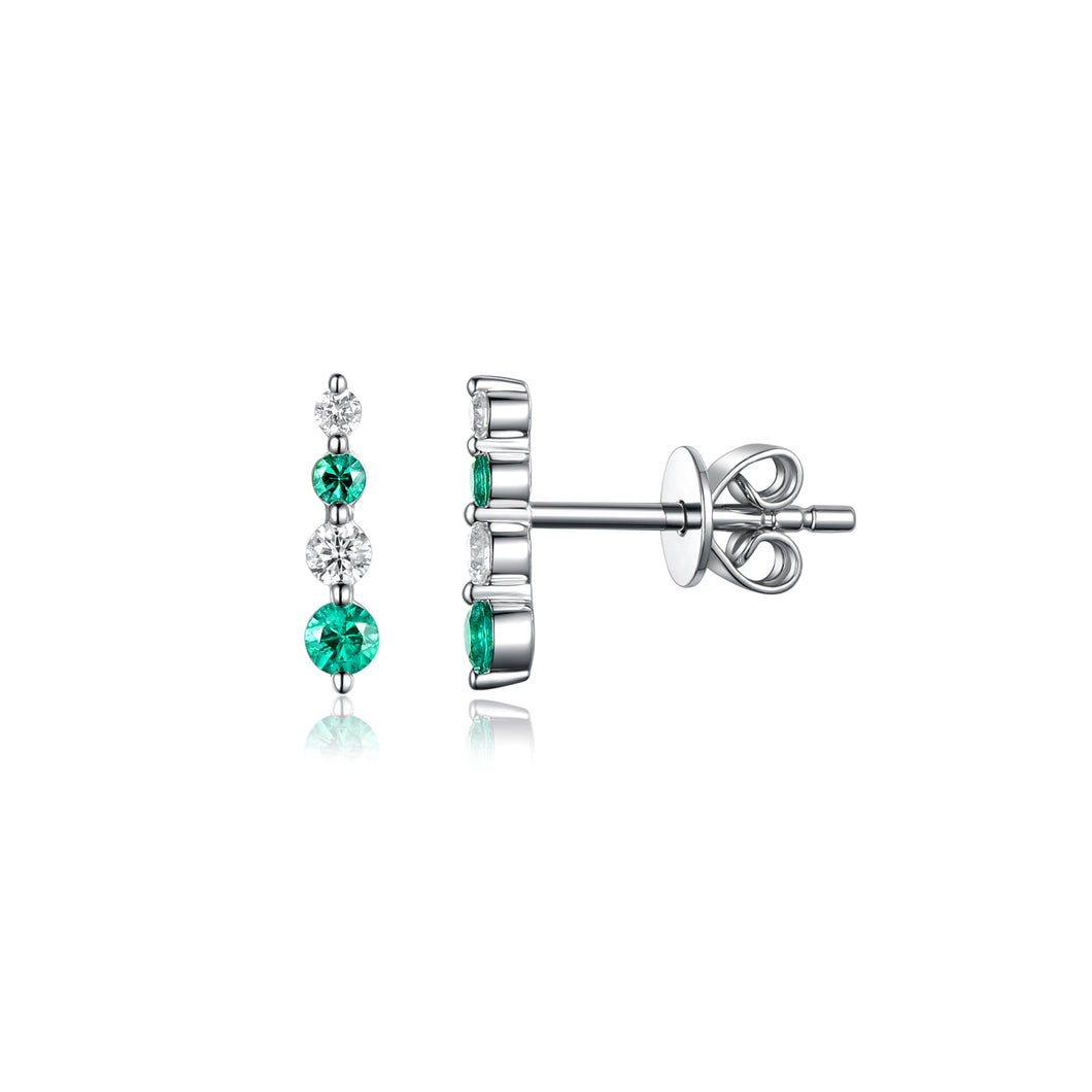 14K white gold with rhodium finish earrings featuring green emeralds and diamonds to create the tiny bar stud.
